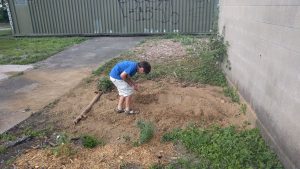 When I got off work this afternoon, I ventured over to the farm and met Laura and Joe.  In our new bed, we planted corn, carrots and sunflowers.  Joe helped out by sowing the seeds.  Hopefully in a few weeks we will have something appear.  We are going to have stuff growing everywhere.